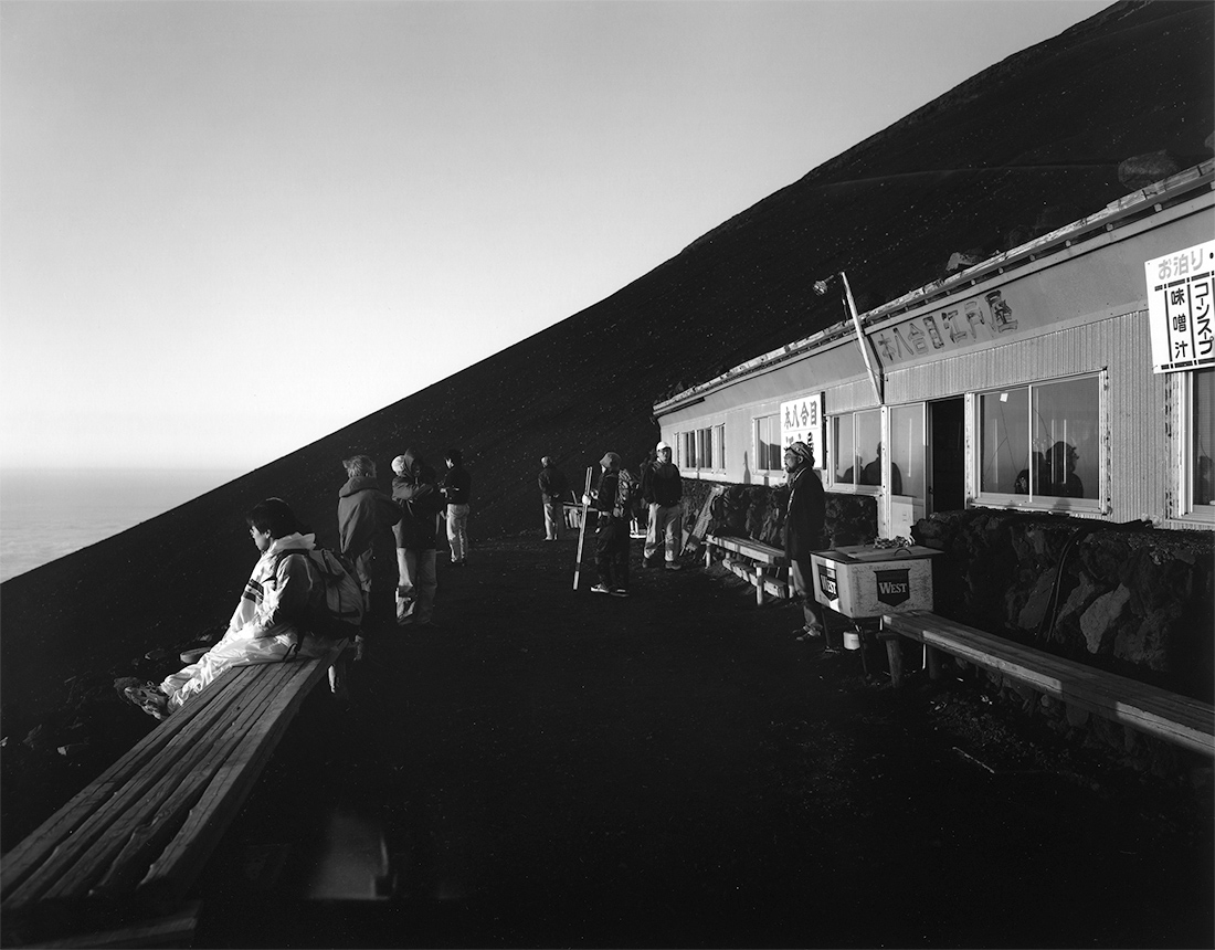 首都高速道路に乗った時は32度を越えていた真夏の昼下がりだった。幾つかの橋とトンネルを過ぎるたびに少しづつ海抜を上げる高速道路のその出口にくる頃には、この季節にはよくある夕立ちが路面を濡らしていた。車内は25度位にエアコンをセットしてあったが、窓を開けるとそれより涼しい空気が、雨のにおいといっしょに、車の中に流れ込んできた。高速道路をおり、今日は低い雲がかかり山の姿は見えていないが、この山懐の街に来ると縁起を担いですることが二つある。最初の山登りが無事に済んだことから、今日も先ずバイパスの立体交差の手前にある、黄色の看板の郊外レストランで、あのうすいハムと野菜のサンドイッチにコ-ヒ-で早めの軽い夕食を済ませる。それからこの山の五合目まで車で上れる山道にさしかかる十字路の角にある、青い色の看板のコンビニエンスストアで、夜食の赤飯のおにぎり二つとあんパンを手に入れることにしている。それは他愛もないことで、いつかの山登りの時、これに寄らずに登った時、八合五勺で下山を余技なくされたことがあったからである。靄のかかった九十九折れの山道を一気に登り切った五合目の駐車場に、少し渋滞したが、運よく登山口に近い所に駐車する事ができた。はやる気持ちを抑えて車から下りた時には、日の入り前の秋風のような心地よい風が辺りを和ませていた。形だけの登山口のゲ-トの脇には神社が鎮座している。その隣には半世紀近くは営業していると思われるこの広場で一番風格がある建物のお土産やがある。疲労感と達成感が入り交じった下山したてのグル-プの会話を耳にし、初めての登山らしい若者達が小走りの早さで、しばらく歩くと忽然と無くなる木々の間の登山道を、夕闇せまる光の中に吸い込まれて行くさまなどを、背もたれがホ-ロ-製の牛乳屋の看板のベンチに座り時の経つのを待つ。はやる登りたい気持ちを抑えて待つ。ここは既に海抜2300メ-トル。ここから頂3700メ-トルまで水平距離6キロ標高差1400メ-トル、こんなきちがいじみた登山道があっていいものか。兎に角、体が高度に慣れるのをここで待つ。日が入り、星が一つ二つの時に出発です。そう此から先20時間、この山の懐にいる間は、何が、何処で、何時、誰が、をうち消した時空の中に入るのです。眼下には民家の電灯、道路の水銀灯、商店街の明かり、ホテルのネオンの光を従えてこの山が経って造り出した堰止湖が、如何にも此から宇宙の彼方に舞い上がろうとするかのように、浮き上がって見えるのです。遙か山並みの彼方にはあの大都会の放つエネルギ-が幾重もの光の弧になって解き放されています。仰げば白鳥が天の川を従えて大きく羽ばたき、その周りを流星が我が物顔で遊びめぐります。ふと足元に目をやれば既に夜目になっている瞳孔がとらえるのは、岩と我れがくりだす小幅の左右の歩みです。一歩そして又一歩、これがこの世の全てです。なぜか六根清浄のかけ声が実感できるのです。一歩一時が進みやがて東の地と空の接点が小さくはじけ、それは瞬く間に両手いっぱいまで拡がり、そこに今日という太陽が生まれ出るのです。