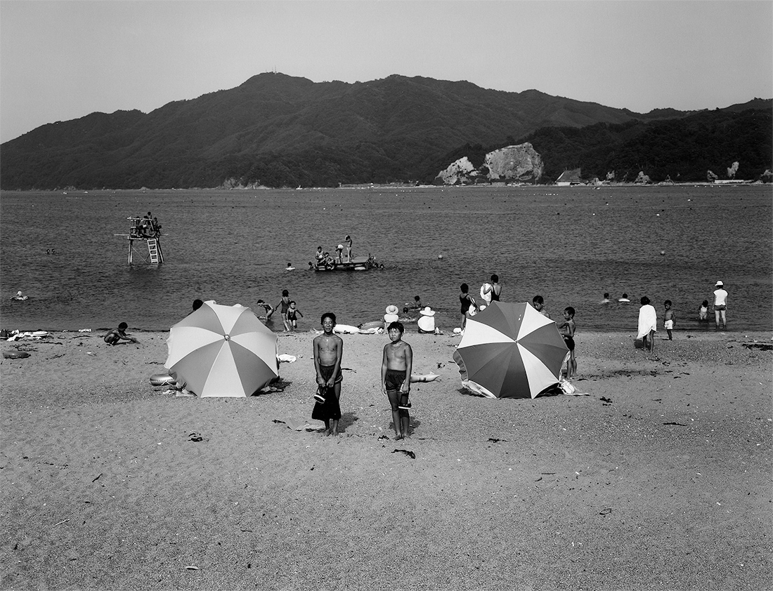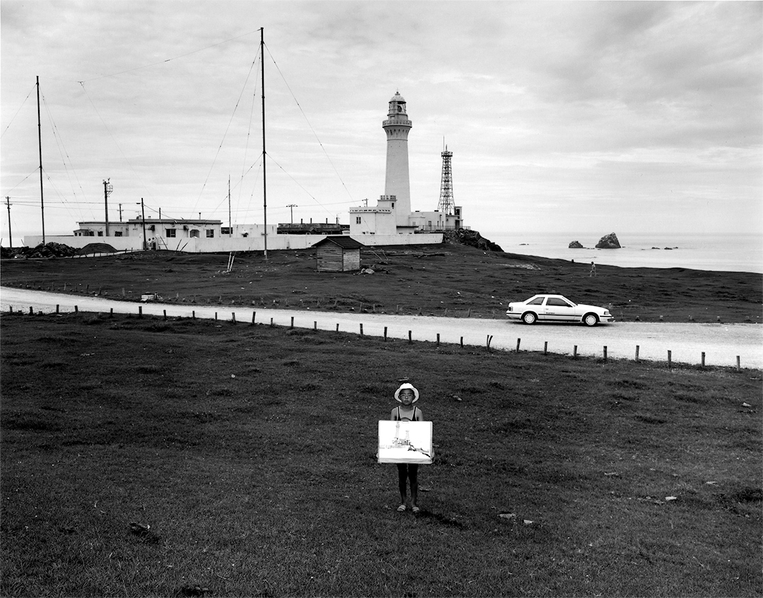 The hazy horizon stretches endlessly beyond the breakwater. There, I had just seen a sailor in blue shirt, hastily preparing for departure on a deck. Sailing away, the foreign ship eventually became small as a dot, as if it were being swallowed by the sea. The bus halted at the stop in front of a variety store, where three vending machines stood side by side. No one got off. The bus started moving again, turned the corner of a cross section and disappeared into the scene of the neighborhood . A man with a straw hat, tied with a towel , approached on a bicycle from the small pass leading to a pine wood. The rhythm of his pedaling feet was strangely synchronized with the splashes of the waves against the beach, where fish nets hung to dry. There was no one to be seen at the rather small fish market. A gash of wind hurled a styrofoam box for the fish, making it disappear into the bottom of a half-painted boat which was on the shore fore repairs. I guessed there had been a festival , because a "torii " (a gateway at the entrance to the Shinto shrine) with a brand new "shimenawa" (an ornament for "torii")was visible. By its side, there stood a mercury lamp, forgotten to be turned off. On top of its rusting pole, the lamp was burning dull and white as if were being bullied by the sunlight. About an hour passed. I heard a small sigh, coming from the opposite bench from where one could get a full view of the sea and the city. A little while ago, when I had reached the lighthouse at the top of a cape, after climbing a long stairway, I had met a boy in a white open-necked shirt, holding a sketch book with a few lines drawn, under his arm. He had told me not to look until it was finished. I stepped over the white chain with many coats of paint on it, and peeked quietly. There, the boy was standing proudly with his picture, which looked as if the lighthouse had cast its shadow on the sketchbook.