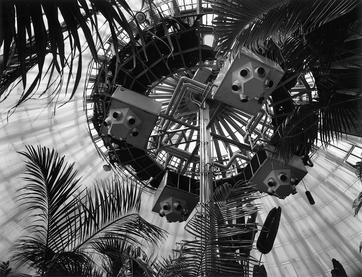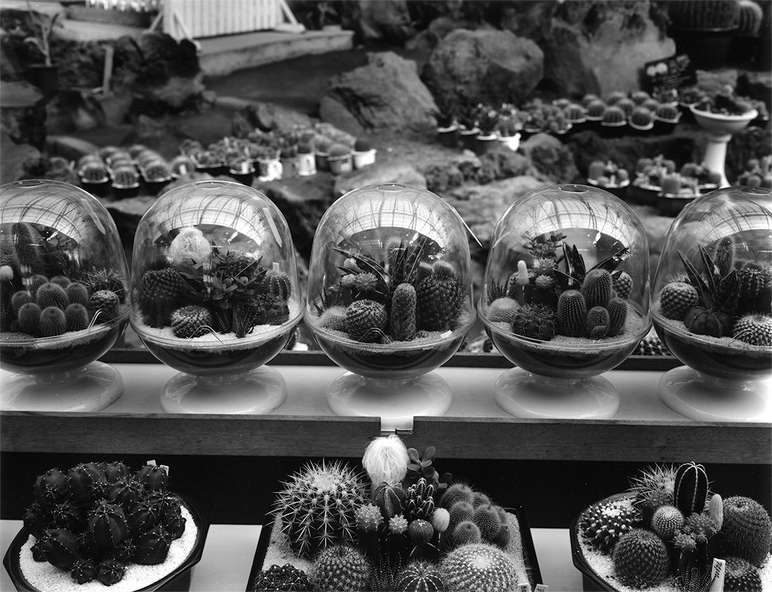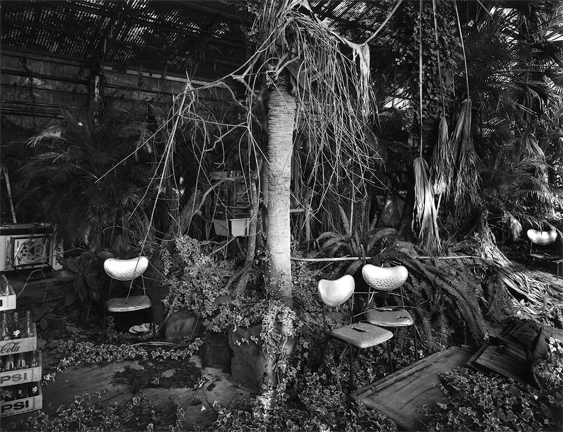 幼年期を最も身近な遊び場としての温室は幼瞳の発見の場であり、机上であり、時には傷心を癒してくれる揺籠のような存在でした。時が過ぎ再び温室に巡り逢い、着想したのは「ガラスを覗き見る、ガラスを透過する光」の概念だったのです。ガラスは視覚としての存在感は伴わず、しかし物としての確かなる存在としてのガラスは、その内側と外側の世界を完璧に分離する、そのものなのです。そして、それは、わたしの写真の永遠の仮題である、見る者への二重視覚をたちあがらせる、陰と陽、遠さと近さ、過去と未来、夢と現実、仮性と彼岸、といった両極にかけはなれているものが同時に垣間見える世界、これに共通するものなのです。