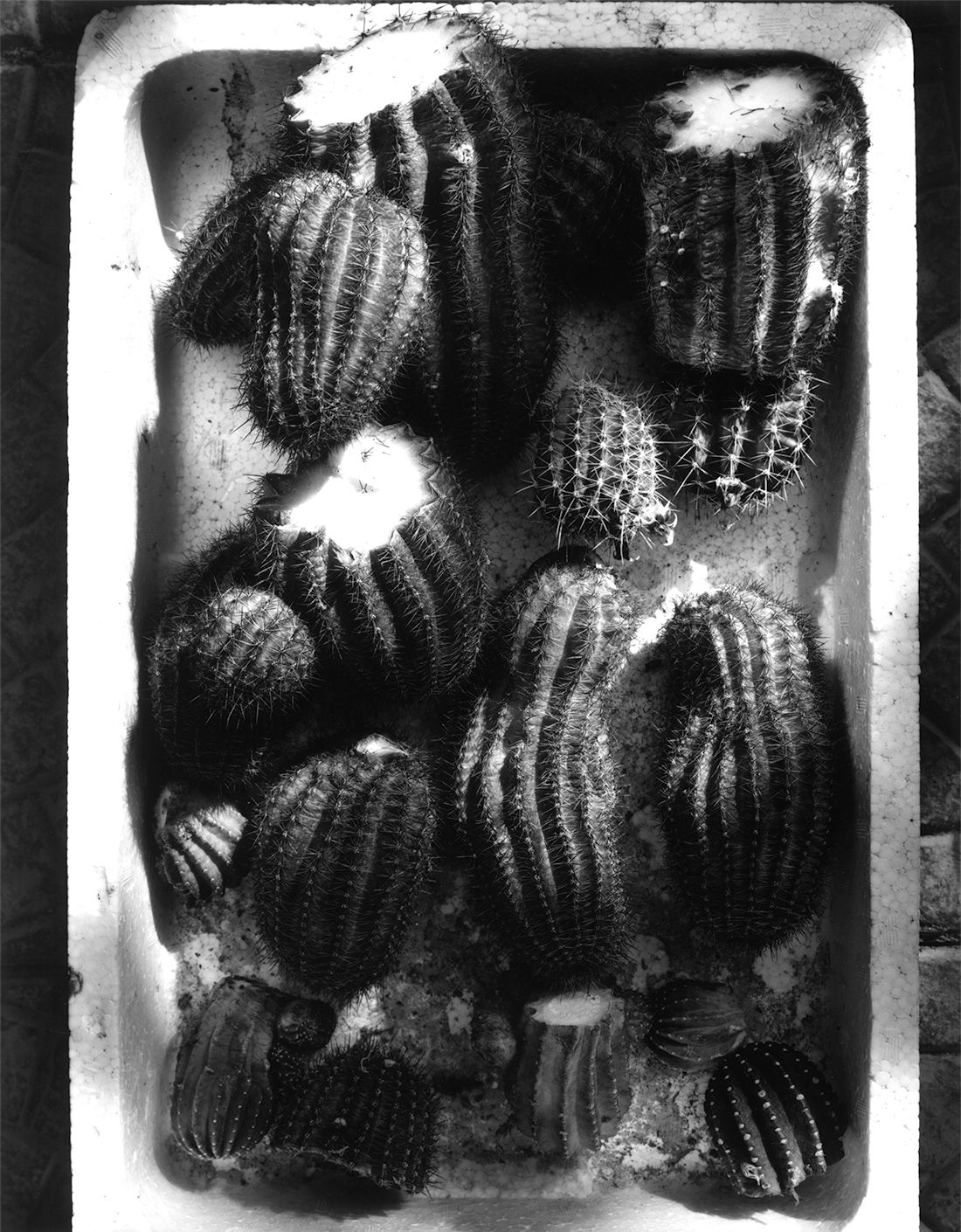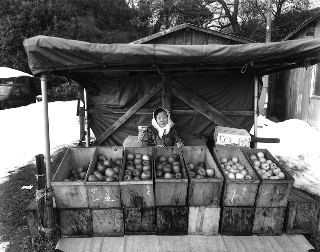 それは世紀が間もなく変わる頃のある夏の旅だった。私には幾度訪れてもいつも不思議な気分がわき起こり、撮影をさせられてしまう土地が幾つかあります。そんな不思議な場所の一つである、大きな砂丘のある街から、その旅は始まった。いくつもの入り江とそれと同じ数だけの小さな漁村を通り過ぎ、盛夏だというのに飛込み台とラッパスピーカーだけが目につく人気の無い浜を見下ろして。その先の漁師町では防波堤の脇では沖は時化ているのだろう、一人の漁師が漁協の帽子に鉢巻をして網の繕いをしている。国道から見られている気配を感じたのだろう、一瞬頭をもたげ眼をあわせられた。それはいつもとおなじに、時は過ぎ、景色は変わり、私は移動する。そしてそのことは俄にやってきた。バイパスが出来た為、海辺りを通る道は見捨てられていた。沖には二つの島影があり、小さな半島を回り込む峠にさしかかった時だった。一抱えとでは言いきれない程の束の夏花を竹籠に生けて背負って行く老婆に会えたのです。グラジオラスにポンポンダリヤ、矢車草に向日葵、カンナにエゾ菊、まだまだ底の方にもありました。底の方がつぼまる背負籠、木綿の絣の肩当て、頭には酒屋の手ぬぐいの姐さんかぶり、汗でしみる、糸瓜襟の白い半袖ブラウス、幾人かの子供を育て上げた遠くを見据える涼しげなまなこ。そして老婆との会話は、彼女は二回首を横に振っただけでした。「写真を撮らせてください」「町まで乗りませんか」